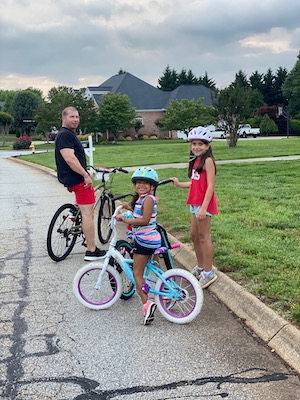 There were lots of art projects, walks around the block, chalk artwork all over our driveway, and occasional weeknight dinner pickups from a local restaurant. The girls got new bikes, and I got the first bike that I’ve had since I was a kid. Karsten learned how to ride her bike without training wheels, with some instruction from Kate and a LOT of stubborn persistence. The three of us girls, plus Kevin, started having regular nightly bike rides around the neighborhood. We spent lots of summer evenings just hanging out on our back porch.