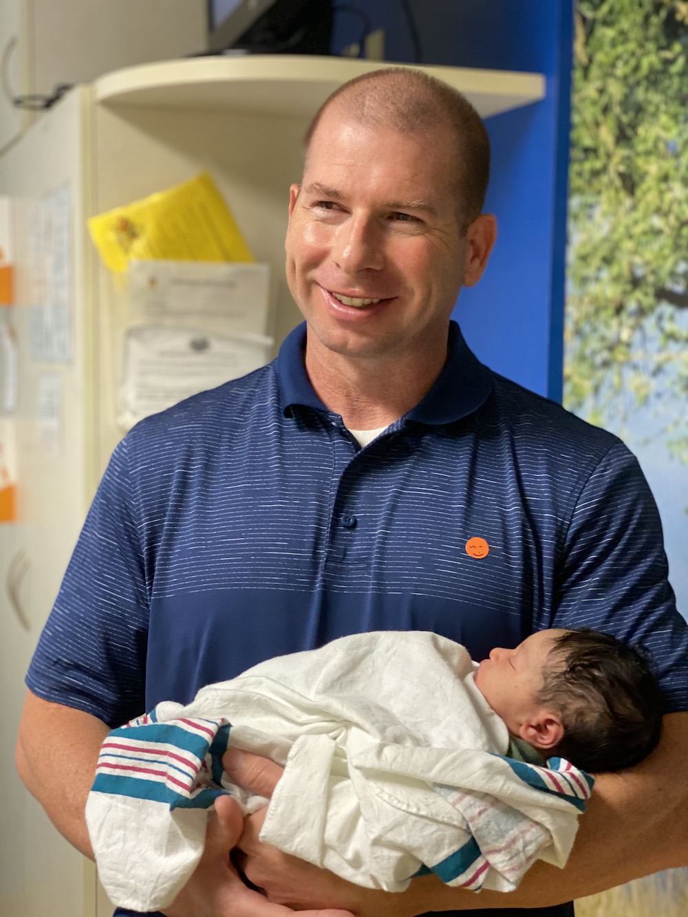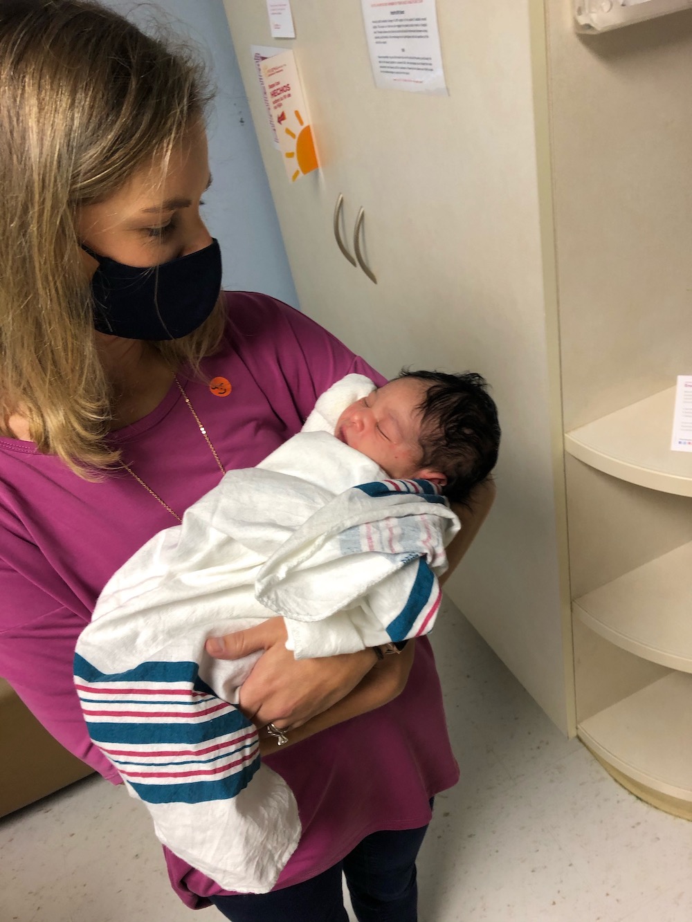 We went through the COVID protocols of checking in (getting our temperature checked, etc) and then headed up to the nursery. As soon as we got off the elevator, there was a nurse holding a sweet baby boy – and it was Kallen! They said he was so cuddly and everybody had been wanting to hold him.